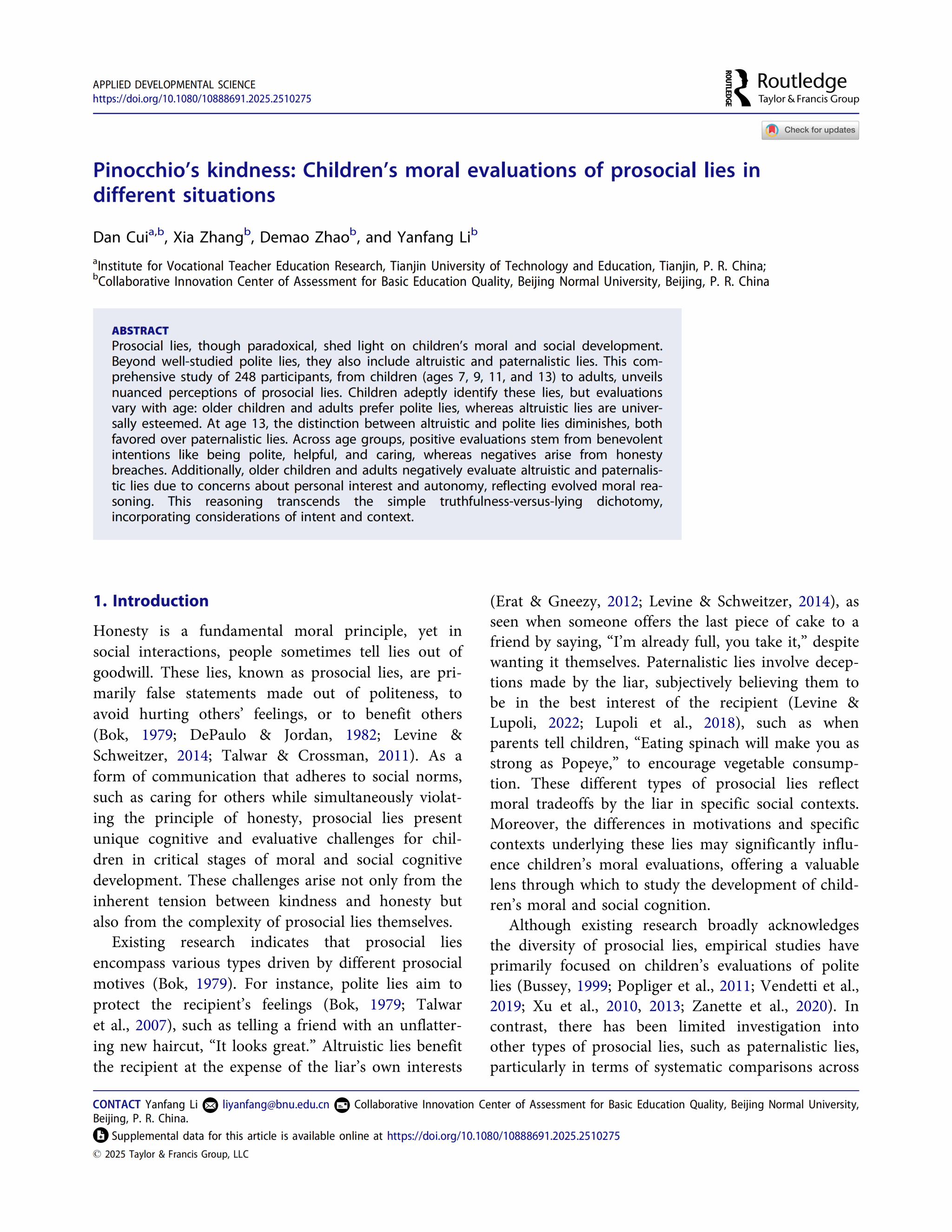 文章:Cui, D., Zhang, X., Zhao, D., & Li, Y. (2025). Pinocchio’s kindness: Children’s moral evaluations of prosocial lies in different situations. Applied Developmental Science, 1-15.