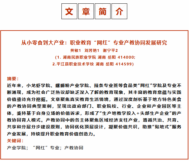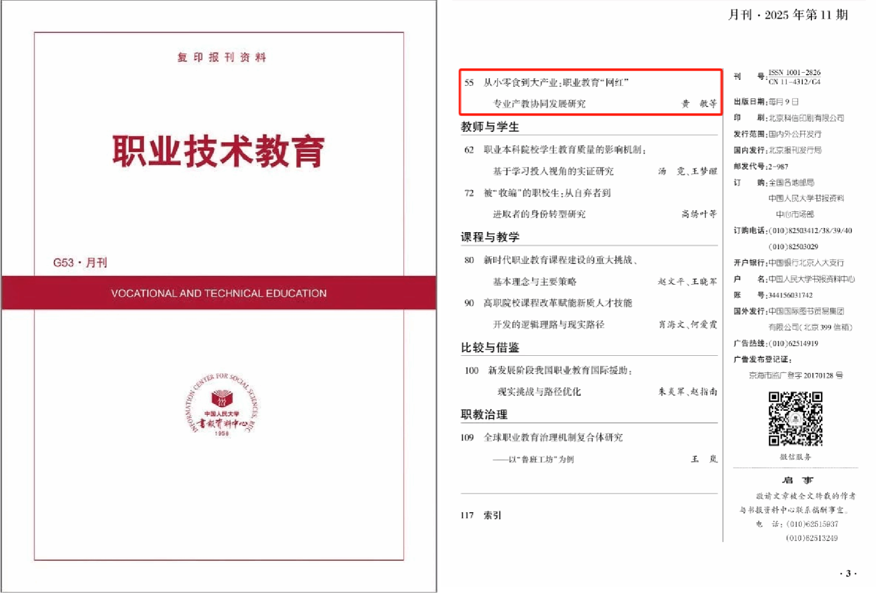 近日,《人大复印报刊资料 · 职业技术教育》2025年第11期全文转载《职业教育研究》2025年第9期文章《从小零食到大产业:职业教育“网红”专业产教协同发展研究》(作者:黄敏 刘芳艳 谢宁平)。